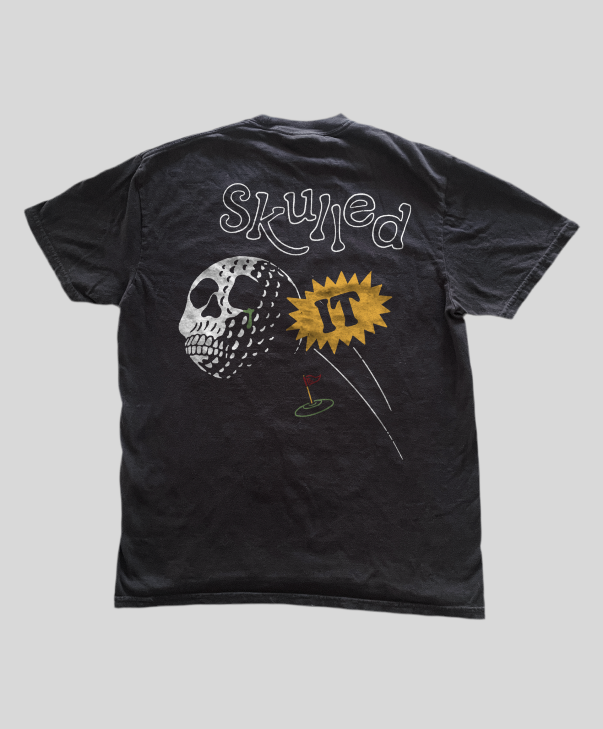 When finesse fails but power prevails. The Skulled It T-shirt features a flying skull-shaped golf ball ripping through the air—a tribute to those less-than-perfect shots that still get the job done. Made from 100% soft cotton, this tee is for the grinders, the hackers, and anyone who's ever turned a bad shot into a great story.